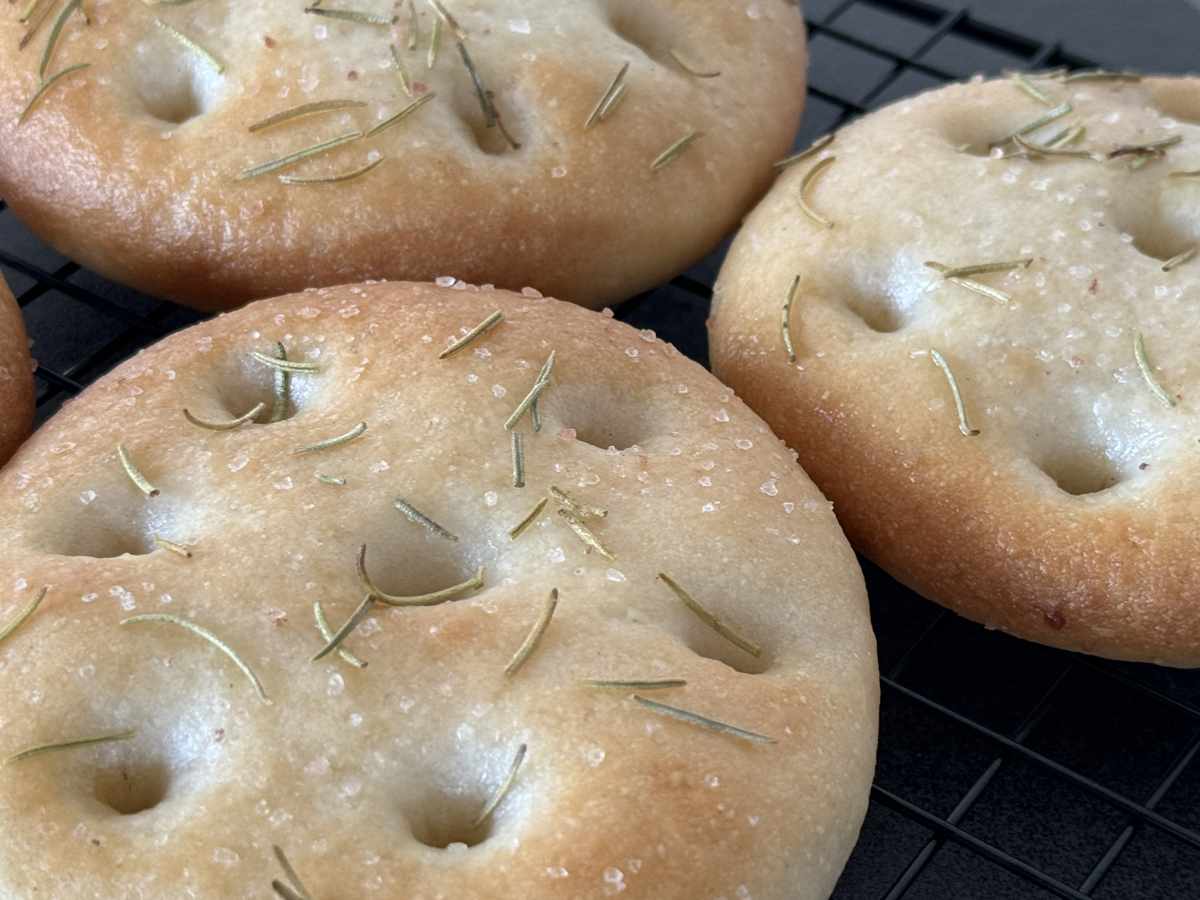 もちっと生地のフォッカッチャ。ローズマリーと岩塩をのせて焼きます。